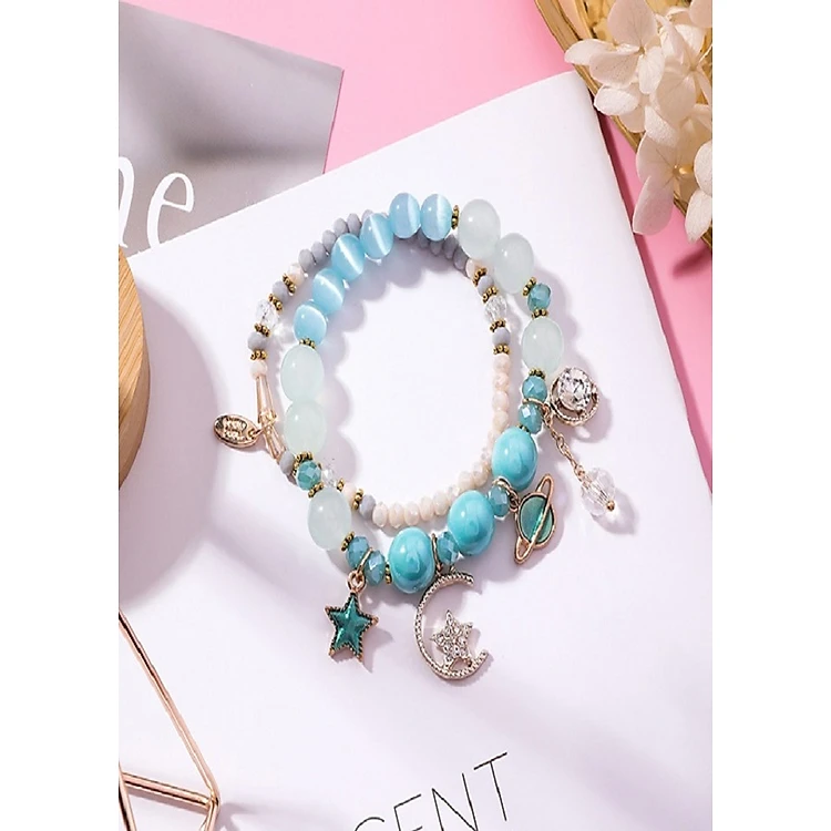 Bộ 2 Vòng Tay Đá Opal Mắt Mèo Phối Charm Trăng Sao