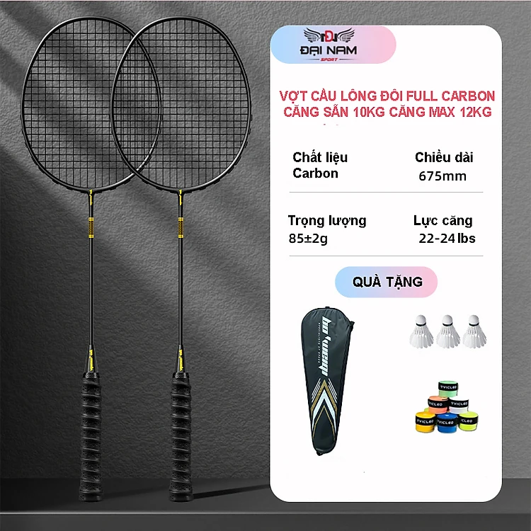 Bộ 2 Vợt Cầu Lông B01 Căng Sẵn 10kg Căng Max 12kg Full Carbon Đại Nam Sport + Tặng 3 Quả Cầu Lông Và Cuốn Cán
