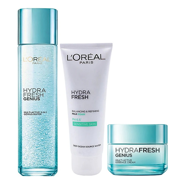 - Bộ 3 Dưỡng Ẩm Chuyên Sâu L'Oreal Paris Hydrafresh Genius giúp cân bằng độ ẩm tối ưu cho da giúp da ẩm mượt, căng tràn sức sống và trắng sáng rạng rỡ