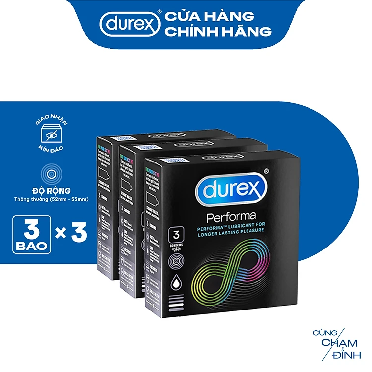 Bộ 3 hộp bao cao su Durex Performa kéo dài thời gian, size 52mm, 3 bao/hộp