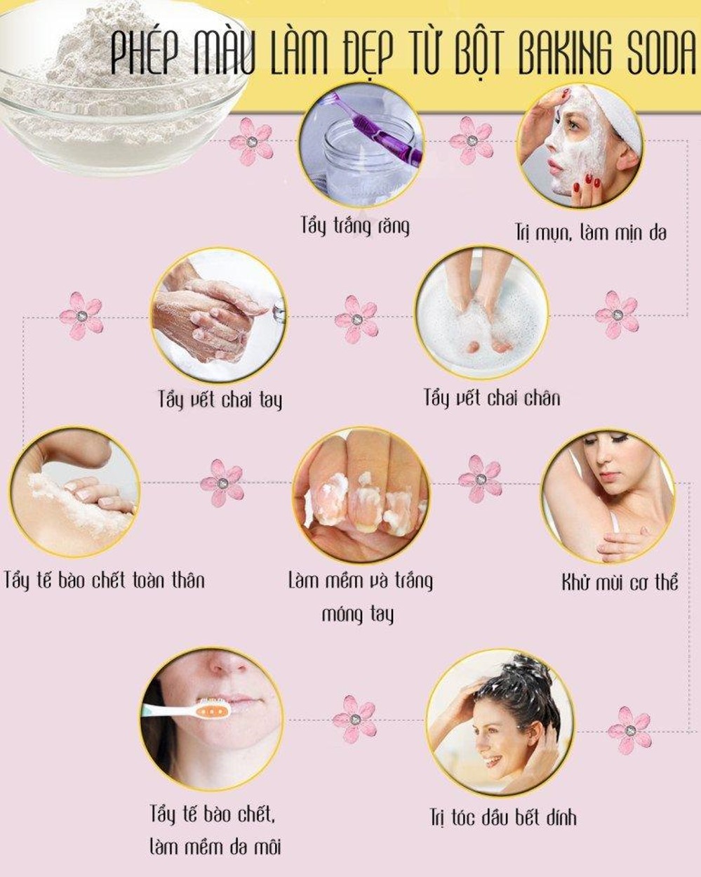 - Tẩy tế bào chết cho toàn bộ cơ thể: Baking Soda được xem như một hoạt chất tẩy rửa đặc biệt hiệu quả và an toàn. Trộn 3 thìa Baking Soda cùng với 1 thìa bột yến mạch xay và thêm 3 thìa nước. Dùng hỗn hợp này và trà nhẹ lên toàn bộ cơ thể theo vòng tròn sau đó rửa sạch cùng với nước ấm.