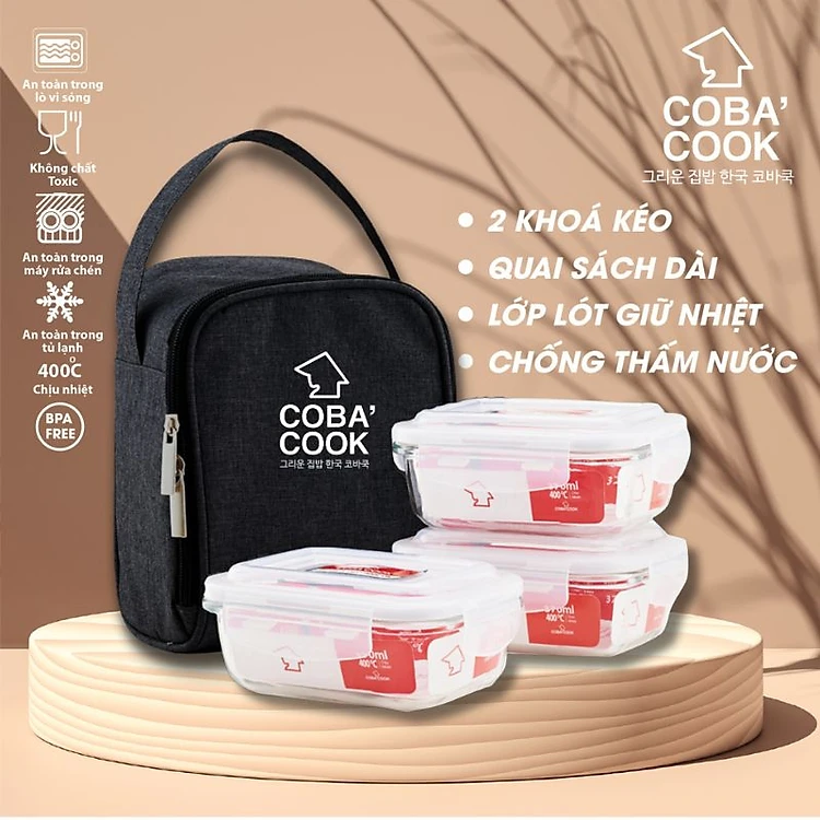 Bộ 3 hộp đựng cơm thủy tinh COBA'COOK chịu nhiệt 3 hộp chữ nhật 370ml và 1 túi giữ nhiệt - CCL33BS-1
