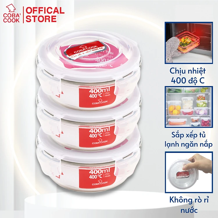 Bộ 3 hộp thủy tinh chịu nhiệt hình tròn dung tích 400ml COBACOOK- CCR43