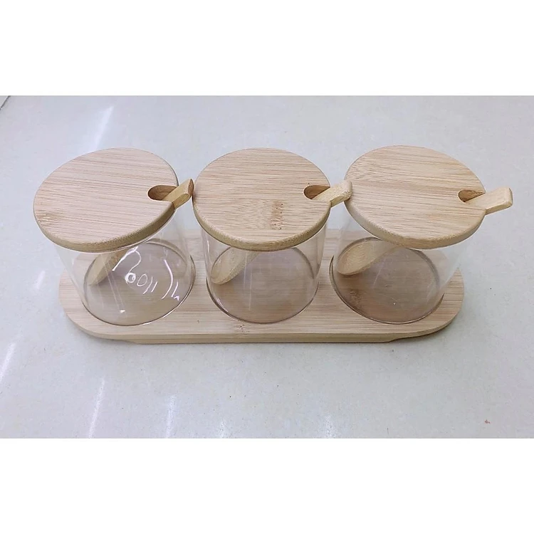 Bộ 3 hũ đựng gia vị thủy tinh cao cấp khay gỗ tre bầu dục