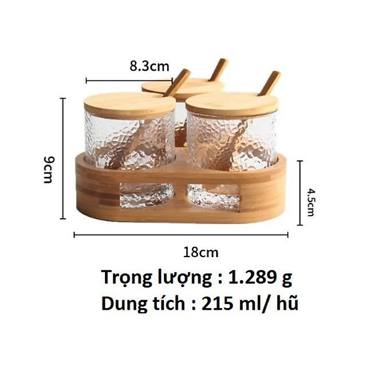 Bộ 3 hũ đựng gia vị thủy tinh cao cấp khay gỗ tre tam giác