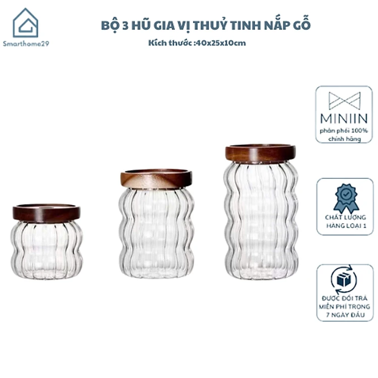 Bộ 3 Hũ Gia Vị Thuỷ Tinh Nắp Gỗ, Lọ Đựng Gia Vị Kín Hơi Với Gioăng Cao Su - HÀNG CHÍNH HÃNG MINIIN