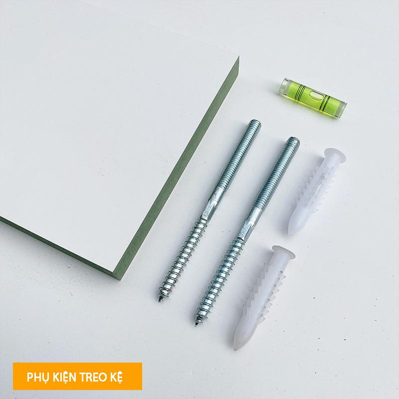 • Bộ sản phẩm gồm đầy đủ phụ kiện lắp đặt (gồm vít thép đặc biệt, tắc kê nhựa) và có tặng kèm 01 thước thủy (nivo mini) để hỗ trợ lấy thăng bằng khi lắp đặt kệ.