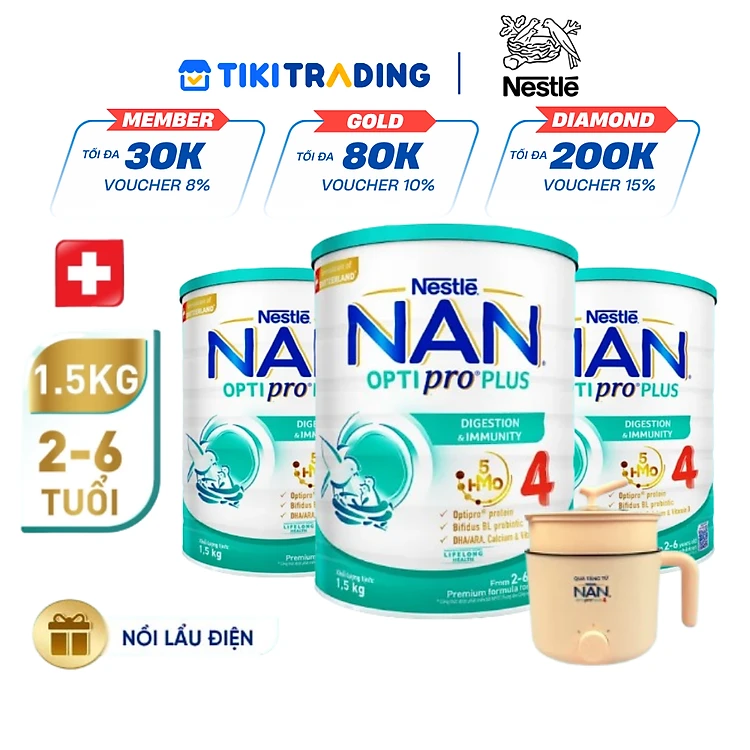 Bộ 3 Lon Sữa bột Nestlé NAN OPTIPRO PLUS 4 1500g/lon Giúp tiêu hóa tốt + Tăng cường đề kháng (2 - 6 tuổi) - Tặng Nồi lẩu điện A2