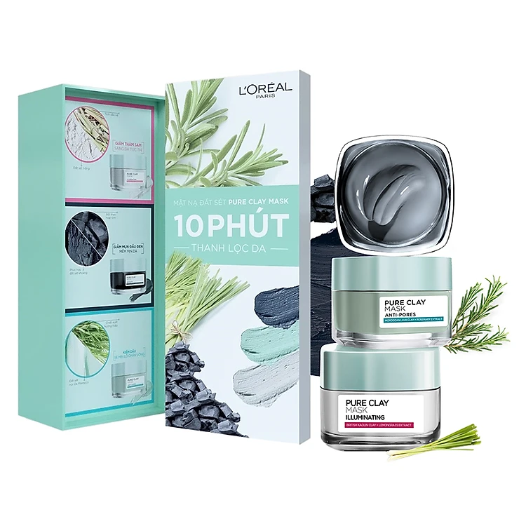 Bộ 3 Mặt Nạ Đất Sét Clay Mask L'Oreal gồm Pure Clay Mask Anti-Pores, Pure Clay Mask Illuminating và Pure Clay Mask Detoxify, được khai thác từ dãy núi Atlas ở Đông Morocco rất giàu khoáng chất như magiê, sodium, canxi, nhôm, silica và sắt,… là một trong những sản phẩm tốt nhất cho da nhờn da khô, da, mờ hoặc bị mụn giúp thư giãn, cải thiện sức khỏe và sức sống của làn da.