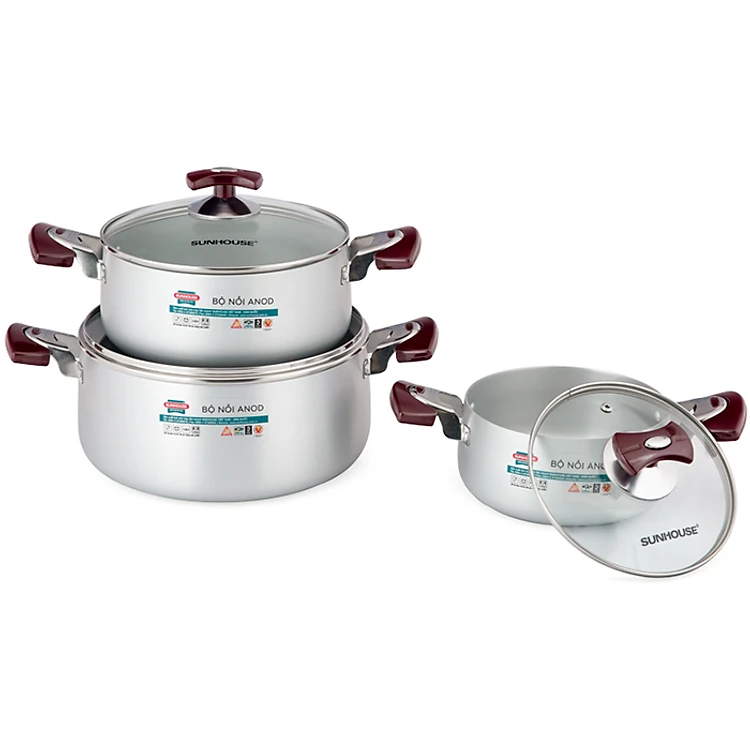 Bộ 3 Nồi Anod Vung Kính Sunhouse SH8833EB Trắng Bạc (18cm, 22cm, 26cm)