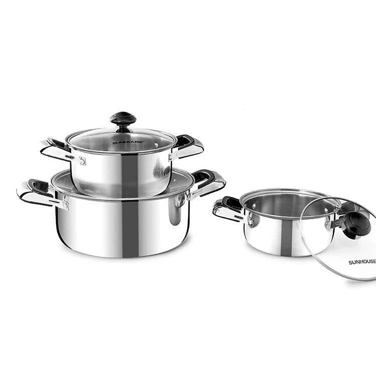 Bộ 3 Nồi Inox 1 Đáy Vung Kính Sunhouse SH365 (16cm, 18cm, 24cm) bao gồm 3 nồi với kích thước lần lượt 16cm, 18cm và 24cm đáp ứng tốt nhu cầu sử dụng. Thân nồi được thiết kế bo tròn ngay đáy, tạo cảm giác thân thuộc.