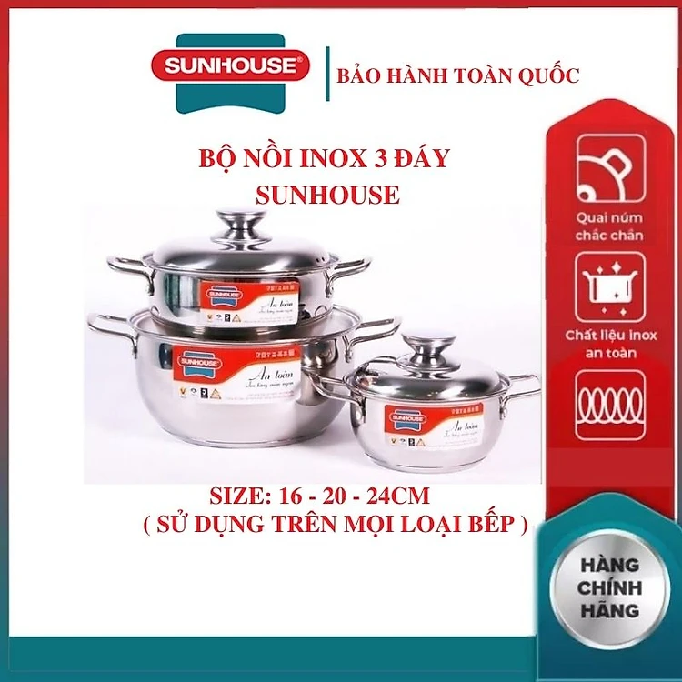 Bộ 3 Nồi Inox 3 Đáy Bếp Từ SUNHOUSE SH335-2022 16cm 20cm 24cm Nắp INOX (dùng được trên mọi loại bếp)