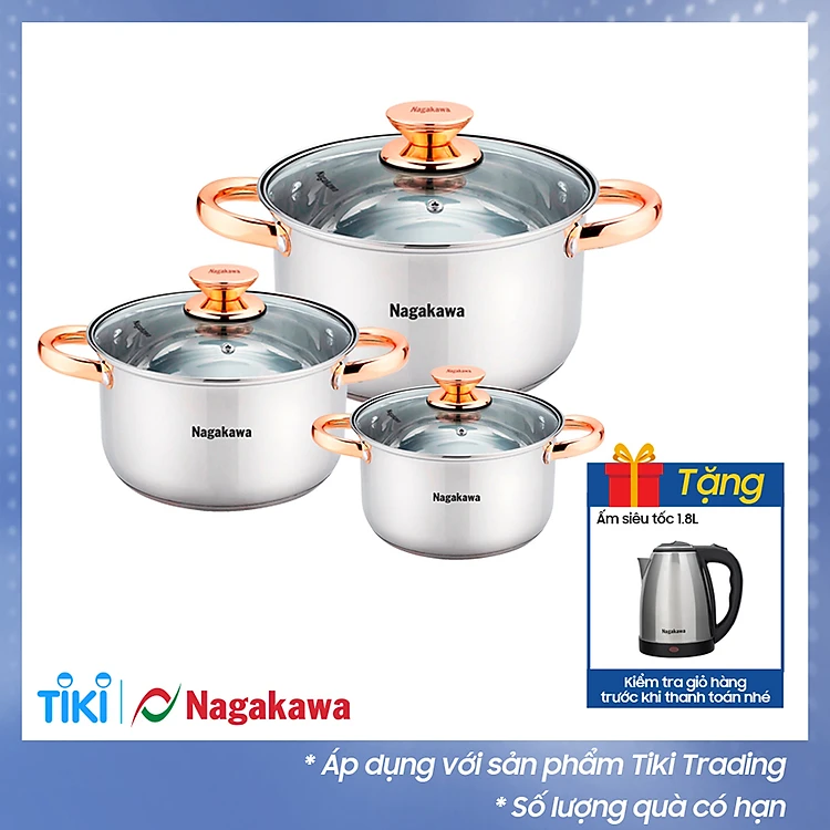 Bộ 3 nồi inox 4 đáy Nagakawa NAG1306 (16cm, 20cm, 24cm) - Quai mạ vàng - Dùng trên mọi loại bếp - Hàng Chính Hãng