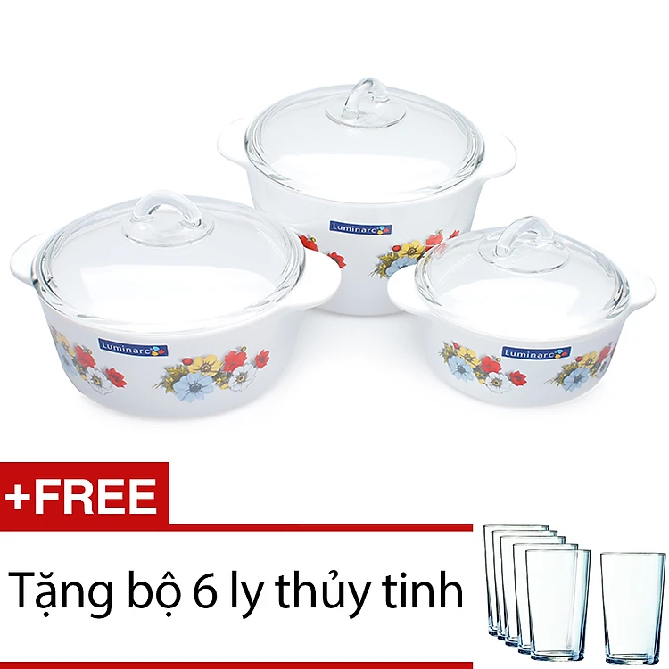 Bộ 3 Nồi Thủy Tinh Luminarc Vitro Flam Anemone (1L + 2L + 3L) - Trắng + Tặng 1 Bộ 6 Ly Thủy Tinh