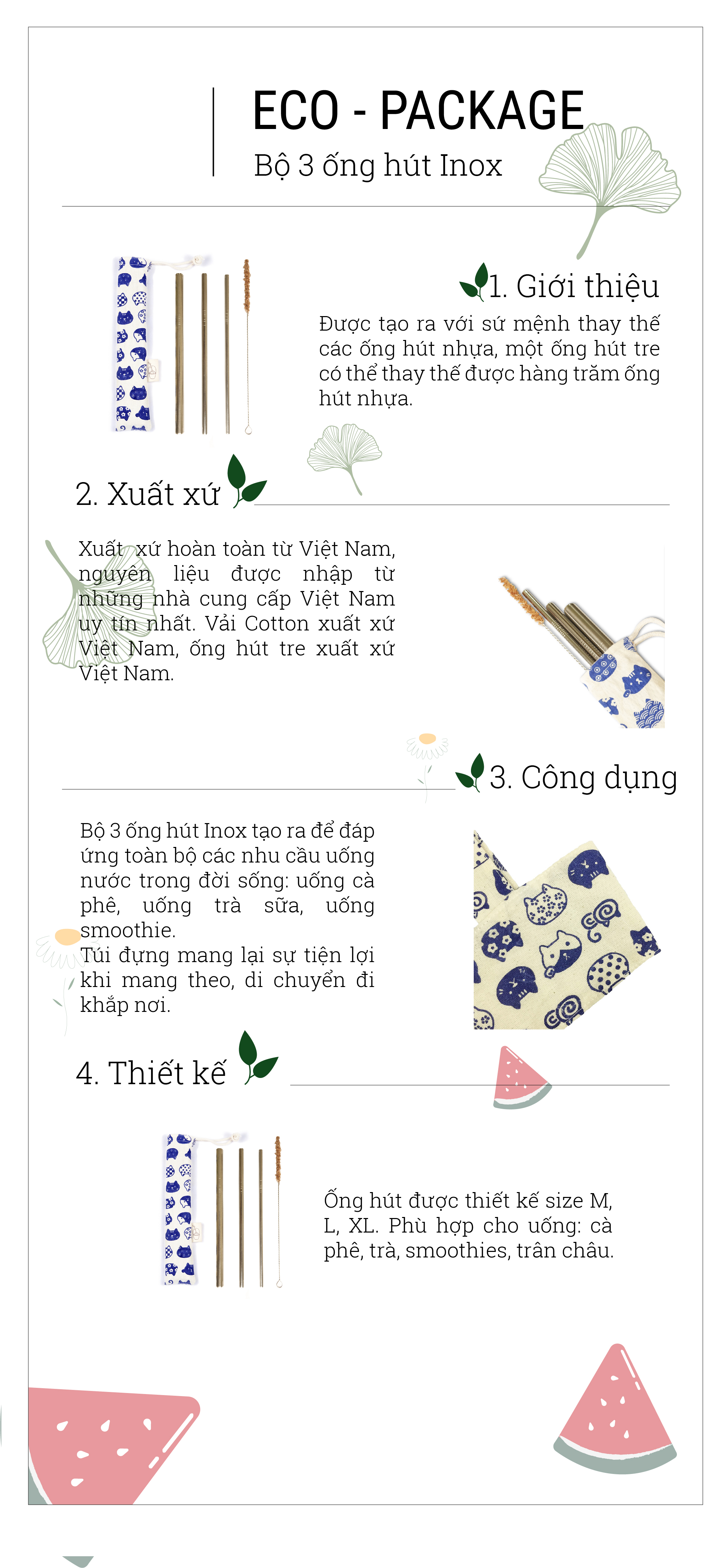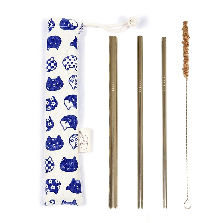 Bộ 3 Ống hút kim loại Inox, Cọ rửa Kim Loại, túi đựng Mèo Xanh eco, thân thiện với môi trường