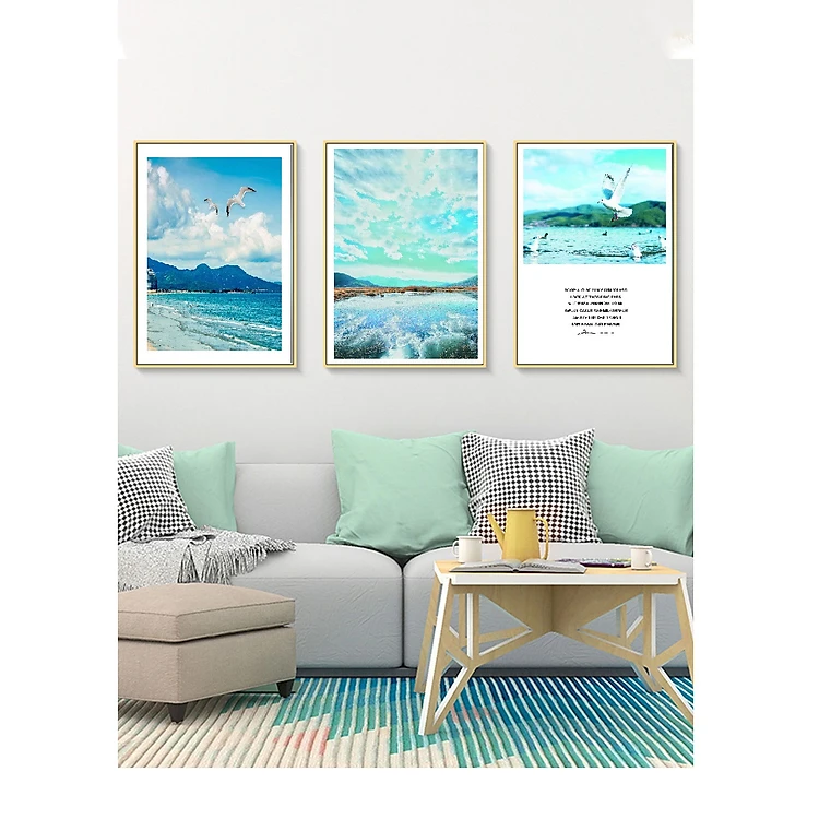 BỘ 3 TRANH TREO TƯỜNG PHÒNG ĂN, PHÒNG KHÁCH, TÔNG XANH BIỂN MÁT MẺ,THIÊN NHIÊN,, HIỆN ĐẠI, KÈM KHUNG MÀU GỖ SIÊU NHẸ, SANG TRỌNG, VÀ ĐINH TREO TRANH TIỆN LỢI PVP-DC325