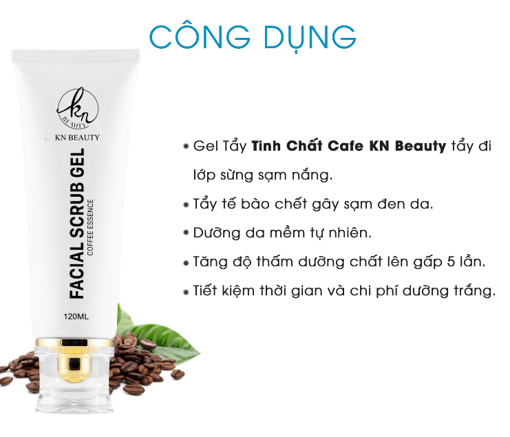 Gel Tẩy Tế Bào Chết Tinh Chất Cafe KN Beauty giúp lấy đi lớp sừng sạm nắng, tế bào chết gây sạm đen da, đặc biệt là hắc tố melanin gây nám da, đồi mồi.