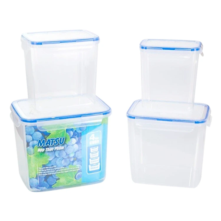 - Bộ 4 Hộp Thực Phẩm Duy Tân Matsu CN09 được làm từ chất liệu nhựa an toàn, không gây hại cho sức khỏe người sử dụng và giữ được hương vị vốn có của đồ ăn. Nắp đậy chắc chắn, giữ cho đồ ăn không bị lẫn mùi với các đồ ăn khác và không rơi ra ngoài khi hộp bị nghiêng.