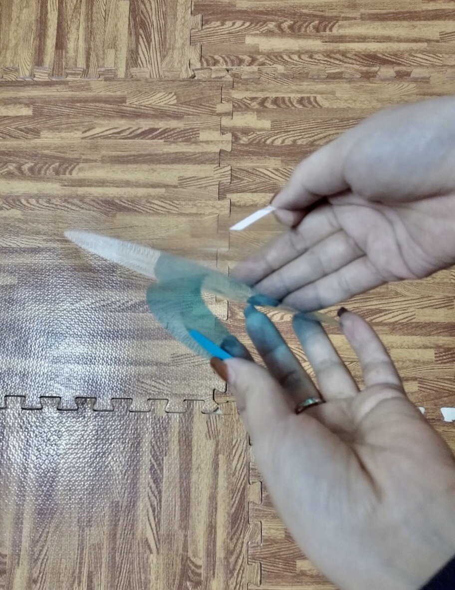 + Bóc lớp thứ nhất(lớp trắng), xịt 1 lớp nước trên gương, sau đó tiến hành dán mặt vừa bóc vào gương.