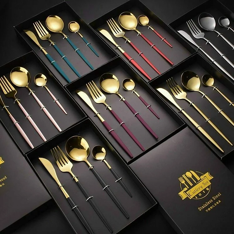 Trong các bữa ăn hàng ngày, Bộ 4 món dao nĩa đũa muỗng luôn là bạn đồng hành của chúng ta, không những giúp cho việc cắt và lấy đồ ăn một cách dễ dàng, Bộ 4 món dao nĩa đũa muỗng mạ vàng còn giúp cho bữa ăn của bạn thêm sang trọng , hấp dẫn.