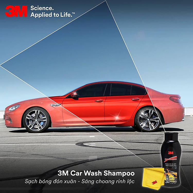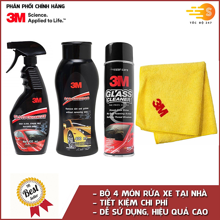 Bộ 4 sản phẩm rửa xe chuyên nghiệp 3M tại nhà bao gồm Dung dịch rửa xe 39000LT, khăn lau chuyên dụng 50400VL, Dung dịch rửa kính ô tô 08888, tăng độ bóng sơn ô tô 39034LT