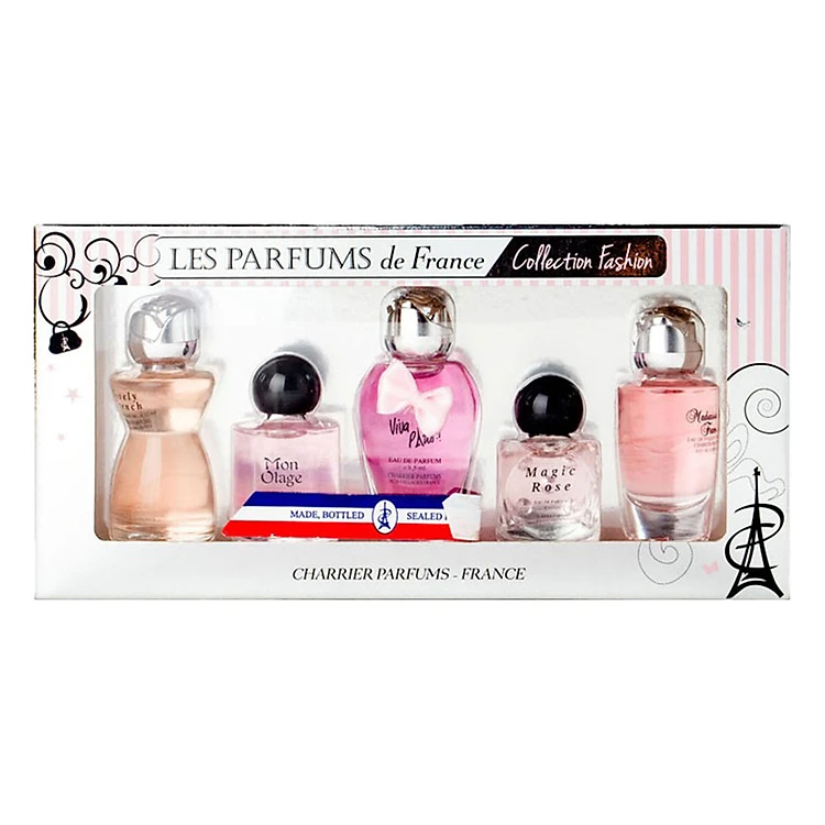 Bộ 5 Chai Nước Hoa Collection Fashion Charrier Parfums P5 gồm Nước hoa Lovely French 12ml, Nước hoa Mademoiselle France 9.4ml, Nước hoa Magic Rose 10.53ml, Nước hoa Mon Otage 9.3ml và Nước hoa Viva Paris 8.5ml với hương thơm nổi bật giúp phái đẹp thêm phần thanh lịch, nữ tính.