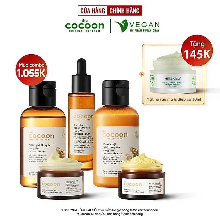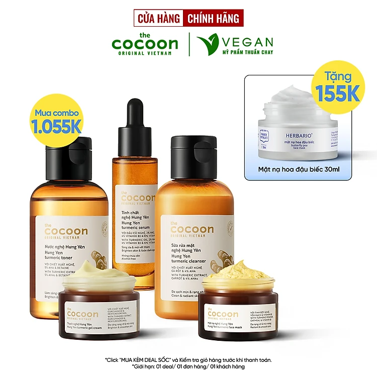 Bộ 5 Chăm Sóc Da Nghệ Cocoon giúp sáng da mờ thâm: Sữa rửa mặt nghệ 140ml + Mặt nạ nghệ 30ml + Toner nghệ 140ml + Tinh chất nghệ 30ml + Thạch nghệ 30ml