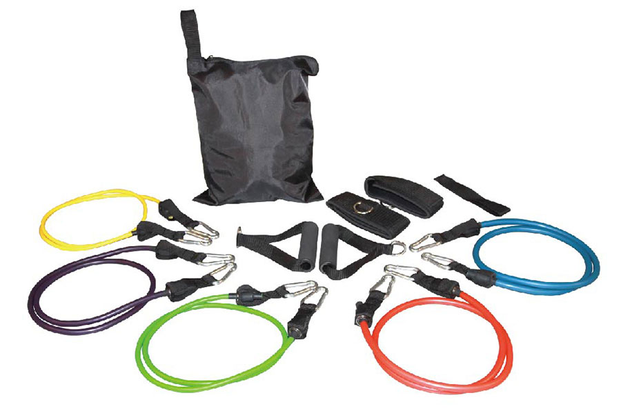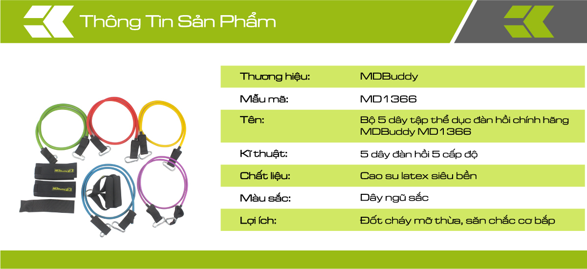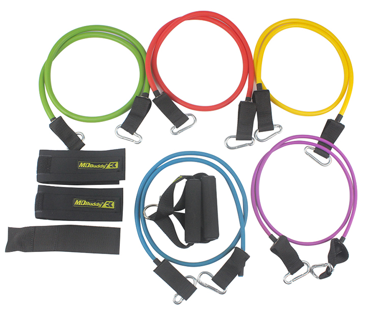 5 dây đàn hồi các cấp độ khác nhau từ nhẹ đến nặng. Mỗi cấp độ được biểu trưng bằng một màu sắc và kích thước dây to nhỏ khác nhau. Tùy theo nhu cầu của người tập có thể tháo bớt hoặc móc thêm dây