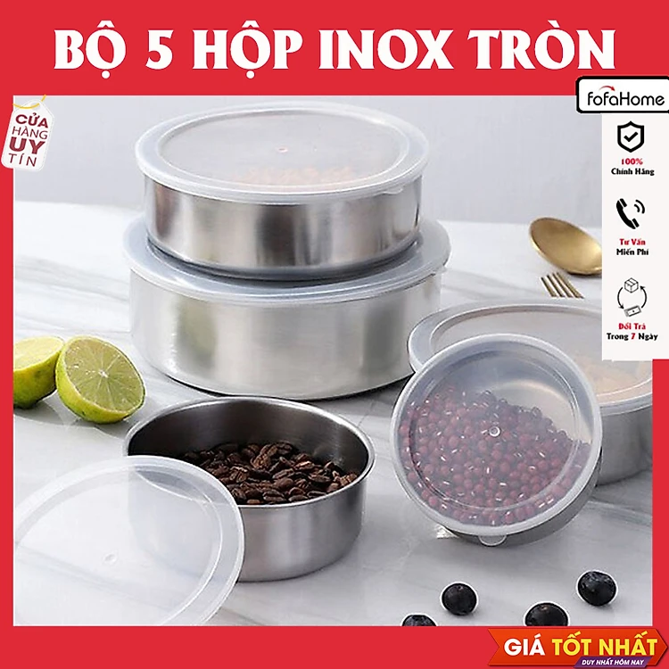 Bộ 5 Hộp Đựng Thực Phẩm Inox, Thố Lạnh Có Nắp Nhựa 5 Kích Thước Để Tủ Lạnh