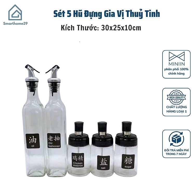 Bộ 5 Hũ Đựng Gia Vị Thủy Tinh Thông Minh (3 Hũ Gia Vị + 3 Chai Cao Nước) - HÀNG CHÍNH HÃNG MINIIN