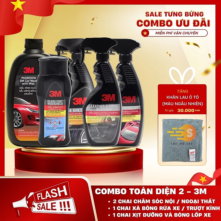Bộ 5 món chăm sóc xe toàn diện gồm chống bám nước, xà bông rửa xe, đánh bóng sơn, vệ sinh da nội thất, lốp xe 3M 3M-CBTDM - tặng khăn lau ô tô chuyên dụng