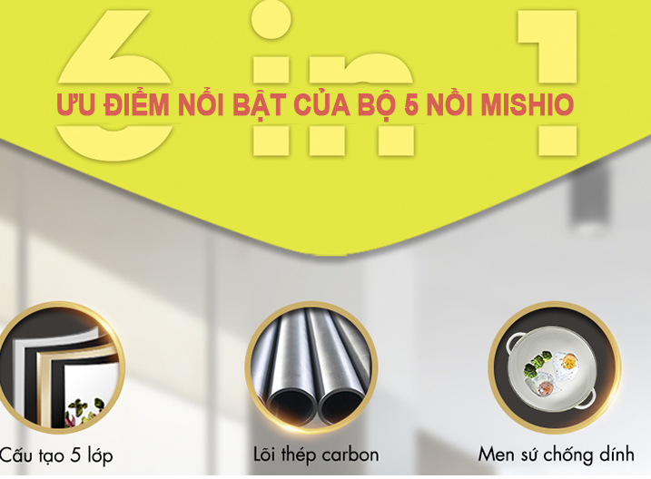 Bộ 5 Nồi nấu ăntThép Cacbon đáy từ Tráng Men Cao Cấp mishio làm bằng thép cacbon không mài mòn, bền chắc, hút nhiệt cao giữ nhiệt tốt trong quá trình sử dụng được giúp thức ăn nhanh chín hơn, với nấp đậy vừa kích với thân nồi giữ cho thức ăn được nóng lâu hơn, tránh được vi khuẩn xâm nhập gây ra các bệnh về đường tiêu hóa cho gia đình bạn.