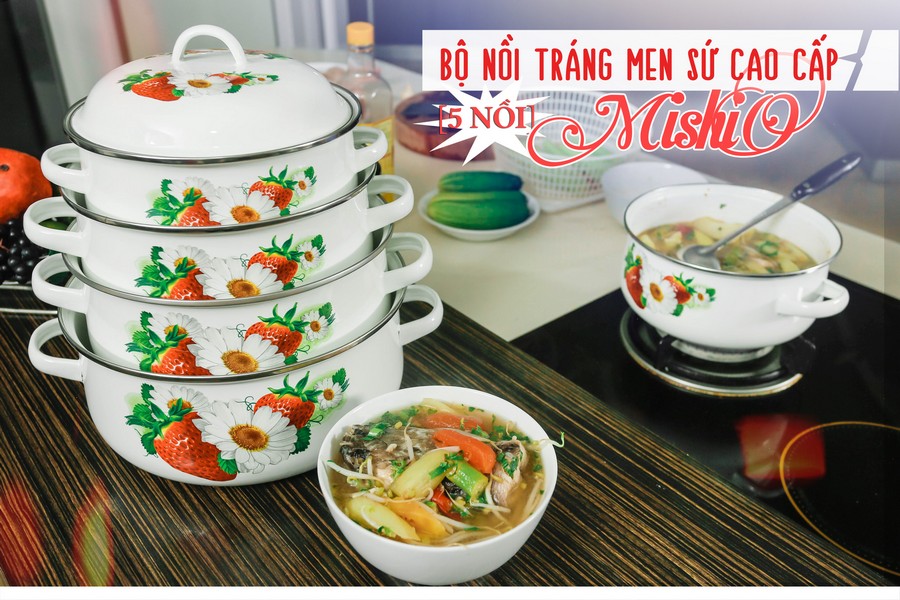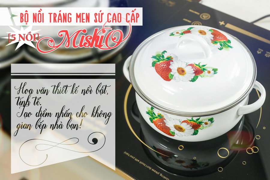 Bộ 5 nồi thép carbon đáy từ tráng men sứ cao cấp Mishio