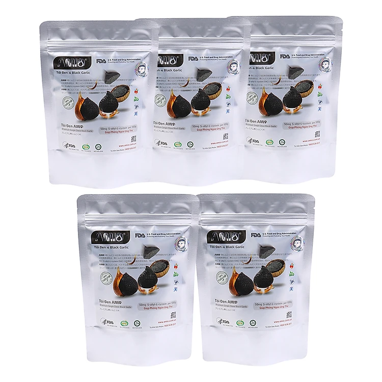 - Bộ 5 Tỏi Đen Amio Một Nhánh Túi Nhôm AMC100 (100g / Túi) được lên men từ tỏi cô đơn trong thời gian 45 ngày, sản phẩm tỏi đen có màu đen, vị ngọt, không còn mùi cay hăng, rất tốt cho việc chữa trị bệnh.