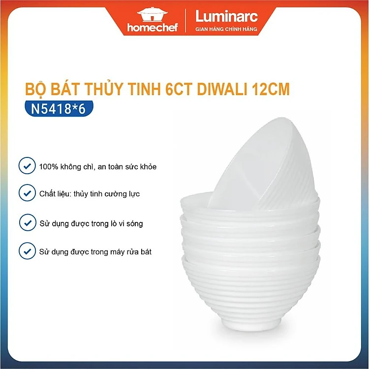 Bộ 6 bát (chén) ăn cơm thủy tinh Luminarc Harena 12cm N5418*6, dùng lò vi sóng, máy rửa bát | Hàng chính hãng