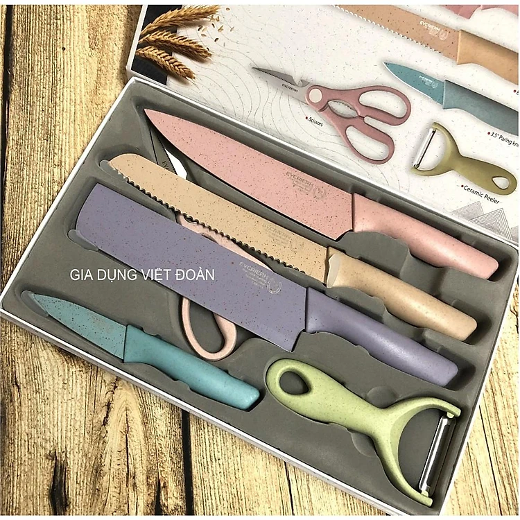 Sản phẩm gồm: 01 dao thái to. : 01 dao thái. : 01 dao thái răng cưa. : 01 dao gọt. : 01 kéo. : 01 đồ nạo.