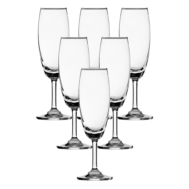 - Mỗi ly nước có dung tích 185ml được thiết kế theo kiểu dáng cổ điển với chân đế và thân ly thon, dài để có trình diễn sự mềm mại từ những bọt bong bóng tạo nên từ loại rượu có ga này. Miệng ly khum nhỏ giúp hạn chế hơi và gas của champagne bay đi mất.