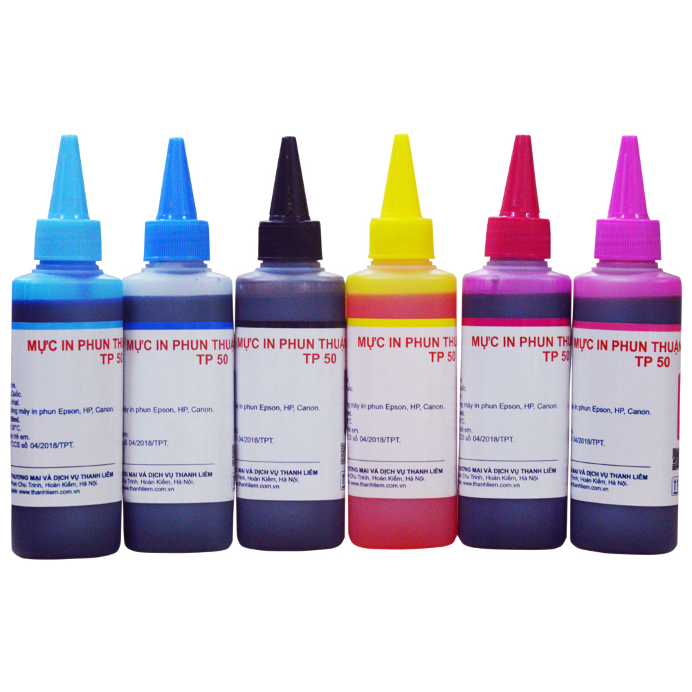 - Mực in phun Thuận Phong TP50 sử dụng cho tất cả các dòng máy in phun HP, Canon, Epson, trừ các dòng máy L series của Epson (Eco-tank system).