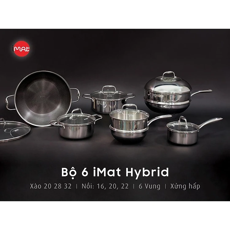 Bộ 6 nồi chảo chống dính bếp từ iMat Hybrid kết hợp giữa lớp phủ điêu khắc chống dính Daikin và inox 430