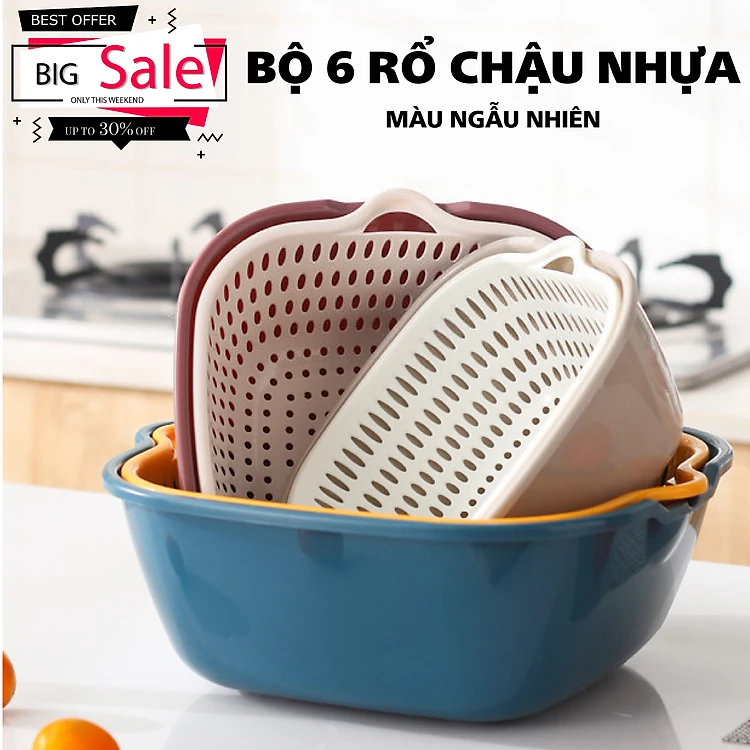 Bộ 6 rổ nhựa kèm chậu tiện lợi, kiểu dáng bắt mắt gọn gàng, vô cùng tiện lợi cho gian bếp của mọi gia đình (Màu ngẫu nhiên)