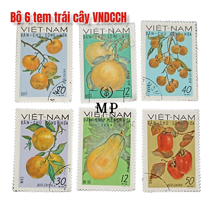Bộ 6 tem trái cây Việt nam dân chủ cộng hoà: cam, bưởi, nhãn, quýt, hồng, đu đủ CTO