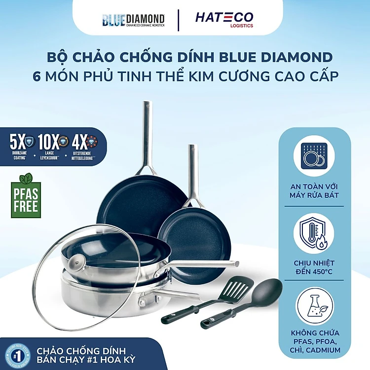 Bộ 6 món chảo chống dính phủ tinh thể kim cương cao cấp Blue Diamond 20, 3x28 cm