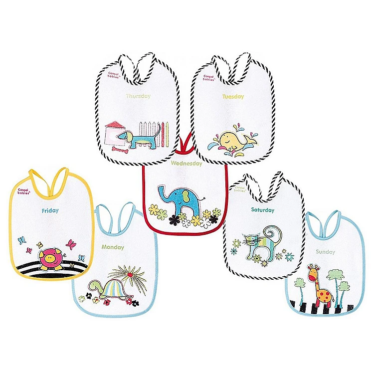 Bộ 7 Yếm Cotton Canpol 2/102 trang bị cho bạn 7 chiếc yếm in hình các loài vật dễ thương như: chó, mèo, voi, heo,… để chăm sóc và giữ gìn vệ sinh khi cho bé ăn dặm. Yếm phối hợp nhiều màu sắc bắt mắt sẽ kích thích thị giác, giúp bé sớm nhận biết màu sắc tốt hơn.