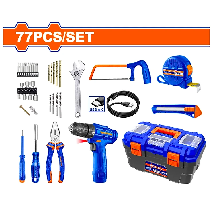 BỘ 77 MÓN DỤNG CỤ CẦM TAY KÈM MÁY KHOAN DÙNG PIN 12V (WCDS510) WDT1B77 WADFOW (KÈM 1 PIN, 1 CÁP USB TYPE A ĐẾN TYPE C) - HÀNG CHÍNH HÃNG