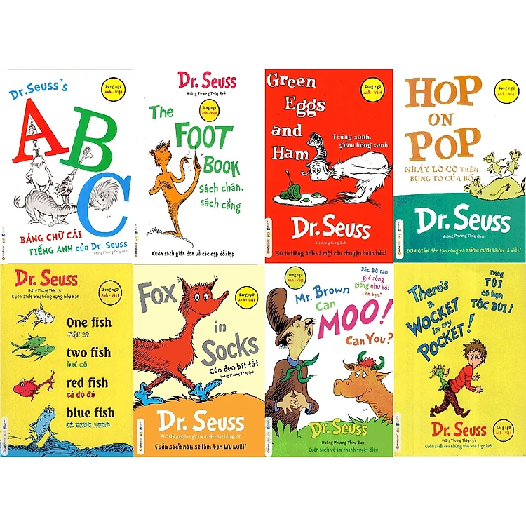 Bộ sách gồm 8 cuốn: Bảng Chữ Cái Tiếng Anh Của Dr.Seuss + Một Cá, Hai Cá, Cá Đỏ Đỏ, Cá Xanh Xanh + Bác Bờ-Rao Giả Rống Giống Như Bò! Còn Bạn? + Sách Chân, Sách Cẳng + Trứng Xanh, Giăm Bông Xanh + Trong Túi Có Bạn Tóc Búi! + Cáo Đeo Bít Tất + Nhảy Lò Cò Trên Bụng To Của Bố