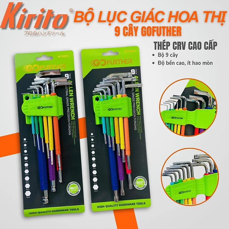 Bộ 9 cây lục giác màu GOFUTHER chất liệu CRV cao cấp, bộ lục giác đầu bi, đầu bông cao cấp