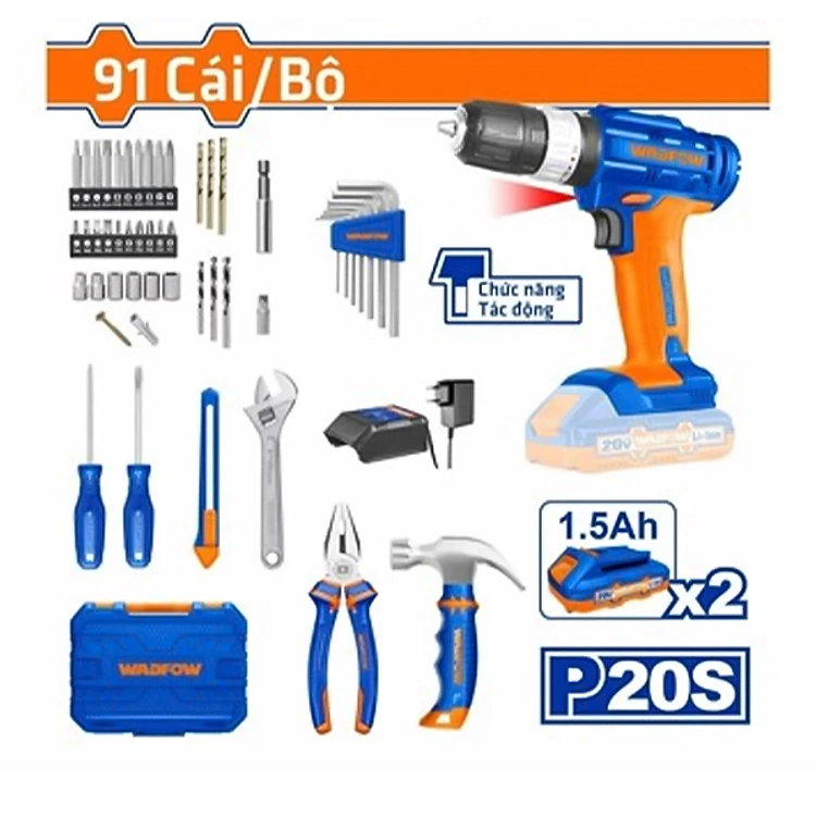 [CHÍNH HÃNG] Bộ 91 món dụng cụ gồm Máy khoan búa dùng pin Lithium-ion 20V (WCDP522) WDT1B90 WADFOW