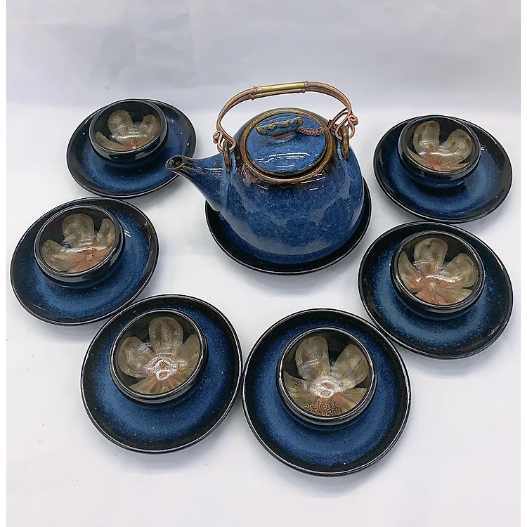 Bộ ấm chén Bát Tràng men hỏa biến dáng trống màu xanh - anth689