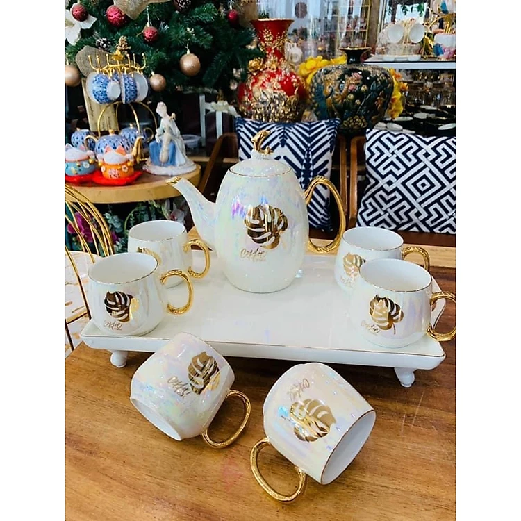 BỘ ẤM CHÉN KÈM KHAY CÓ CHÂN SỨ XƯƠNG CAO CẤP MÀU TRẮNG ÁNH TRAI HỌA TIẾT LÁ VÀNG ( GIAO HỌA TIẾT NGẪU NHIÊN )- VD714