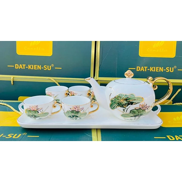 Bộ ấm chén kèm khay pha trà cà phê sứ cao cấp trắng hoa sen ( giao ngẫu nhiên tay cầm )